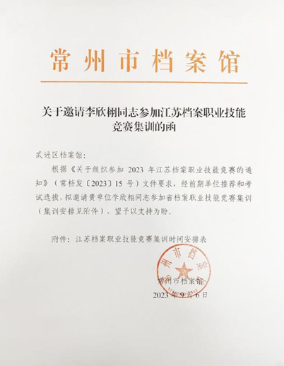 為落實(shí)常州市檔案事業(yè)發(fā)展“十四五”規(guī)劃,加快推進(jìn)檔案人才隊(duì)伍建設(shè),激發(fā)檔案人才創(chuàng)新活力,按照省檔案局、館《關(guān)于舉辦2023年江蘇省檔案職業(yè)技能競(jìng)賽的預(yù)通知》要求,常州市檔案局、檔案館靠前站位,認(rèn)真謀劃,高標(biāo)準(zhǔn)高效率高質(zhì)量推動(dòng)競(jìng)賽準(zhǔn)備工作落實(shí)。
